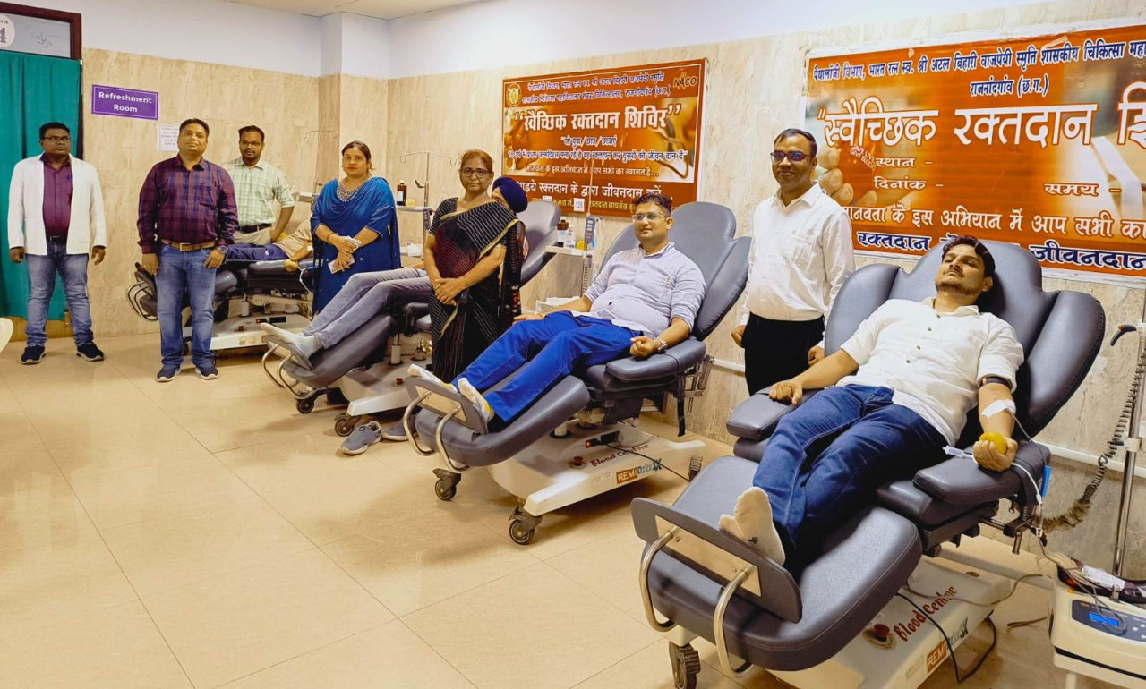 राजनांदगांव छत्तीसगढ़: भारत रत्न स्वर्गीय श्री अटल बिहारी वाजपेयी स्मृति चिकित्सा महाविद्यालय राजनांदगांव में चिकित्सक दिवस के अवसर पर ब्लड सेंटर में रक्तदान शिविर का आयोजन किया गया। अधिष्ठाता डॉ. रेणुका गहिने एवं पैथोलॉजी विभागाध्यक्ष डॉ. प्रतिमा कुजूर ने पौधरोपण के साथ शिविर का शुभांरभ किया। अधिष्ठाता डॉ. रेणुका गहिने ने चिकित्सक दिवस के अवसर पर चिकित्सकों एवं विद्यार्थियों द्वारा रक्तदान करने पर प्रशंसा की। उन्होनें सभी रक्तदाता चिकित्सकों एवं विद्यार्थियों का उत्साहवर्धन करते हुये आभार व्यक्त किया। इस अवसर पर प्रोफेसर एवं विभागाध्यक्ष शिशुरोग विभाग डॉ. अजय कोसाम, डॉ. राघव अग्रवाल, डॉ. अनिरूद्ध गांधी, ब्लड सेंटर बीटीओ डॉ. जलज गौतम समेत कुल 51 चिकित्सकों एवं मेडिकल विद्यार्थियों ने रक्तदान किया। पैथोलॉजी विभागाध्यक्ष डॉ. प्रतिमा कुजूर एवं ब्लड सेंटर इंचार्ज डॉ. चंद्रशेखर इंदौरिया ने सभी रक्तदाताओं को प्रमाण पत्र देकर सम्मानित किया। इस अवसर पर ब्लड सेंटर के स्टॉफ डॉ. ज्योति चौधरी, डॉ. रिंकु सिंग, डॉ. विवके राठिया, टेक्नीशियन श्री चुमेश कुमार साहू, श्री कमलेश कुमार निषाद, श्री जुगेश कुमार टेकाम, श्री कौशल प्रसाद साहू, सुश्री रामेश्वरी सिंग स्टॉफ नर्स सुश्री ममता साहू, श्रीमती दुर्गा निर्मलकर, लैब अटेंडेन्ट सुश्री धनेश्वरी साहू, श्री मोरध्वज साहू, श्री भोजेश्वर गंजीर उपस्थित थे।