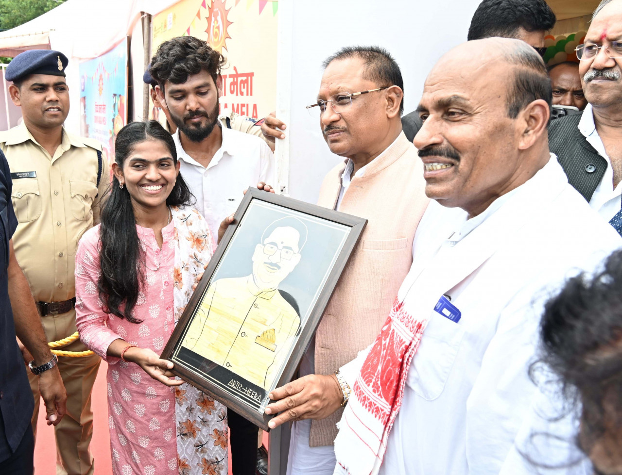 रायपुर छत्तीसगढ़: मुख्यमंत्री श्री साय को राजधानी रायपुर के शंकर नगर स्थित बीटीआई ग्राउंड में आयोजित दिव्य कला मेला में कलाकार सुश्री हीरा धृतलहरे ने अपने हाथों से बनाई पैरा शिल्प पोर्ट्रेट भेंट की। सुश्री हीरा की भेंट पाकर मुख्यमंत्री ने उन्हें उज्ज्वल भविष्य के लिए शुभकामनाएं दीं। मुख्यमंत्री ने सुश्री हीरा से कहा कि उनके पास पैरा शिल्प स्केच बनाने का अनूठा हुनर है और खूब अभ्यास कर इसको निखारना चाहिए। मुख्यमंत्री श्री साय ने कहा कि प्रैक्टिस से परफेक्शन आता है, उसकी बारीकियाँ पता चलती है। लगातार प्रैक्टिस करके वो एक अच्छी शिल्पी बनकर देश-दुनिया में अपना और अपने प्रदेश का नाम रोशन कर सकती है।
