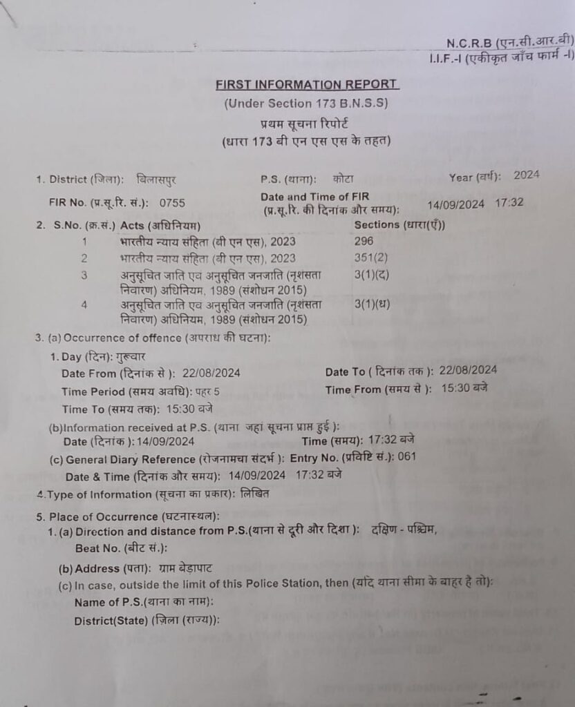 बिलासपुर/जिले के कोटा क्षेत्र के ग्राम बेड़ापाट में 22 अगस्त 2024 को आदिवासी समाज के साथ गाली-गलौच और जान से मारने की धमकी का मामला सामने आया है। इस घटना के संबंध में 14 सितंबर 2024 को शाम 5:32 बजे कोटा थाने में FIR दर्ज की गई, जिसका FIR नंबर 0755 है। अपराधियों पर भारतीय न्याय संहिता की धारा 296 और 351(2) के साथ-साथ अनुसूचित जाति और अनुसूचित जनजाति (नृशंसता निवारण) अधिनियम 1989 के तहत कार्रवाई की गई है। इस मामले में डॉ. गुलाम जी और मातृशक्तियों ने मौके पर पहुंचकर स्थिति का जायजा लिया और संबंधित अधिकारियों से आरोपियों के खिलाफ सख्त कार्रवाई करने की मांग की।