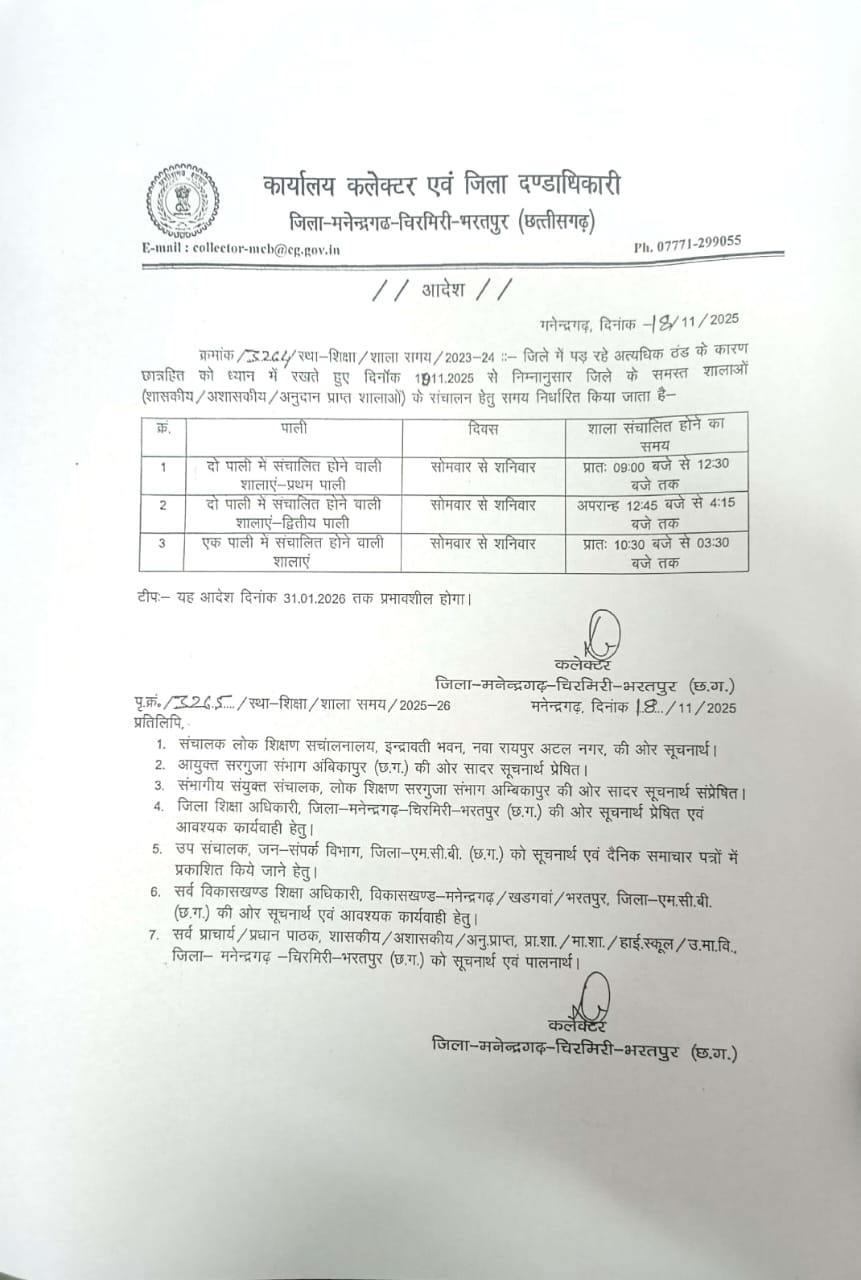 एमसीबी छत्तीसगढ़। जिले में पड़ रही अत्यधिक और कड़ाके की ठंड को देखते हुए, कलेक्टर डी. राहुल वेंकट ने छात्रहित में एक महत्वपूर्ण आदेश जारी किया है। 19 नवम्बर 2025 से जिले के सभी स्कूलों (शासकीय, अशासकीय, और अनुदान प्राप्त) के संचालन के समय में परिवर्तन किया गया है। यह नया समय तत्काल प्रभाव से लागू होगा और 31 जनवरी 2026 तक प्रभावी रहेगा। कलेक्टर द्वारा जारी निर्देश के अनुसार, कक्षाओं का संचालन अब बदले हुए समय के अनुसार किया जाएगा ताकि छात्रों को सुबह की अत्यधिक ठंड से बचाया जा सके। दो पाली वाले स्कूल (प्रथम पाली)सोमवार से शनिवार सुबह 09ः00 बजे से दोपहर 12ः30 बजे तक दो पाली वाले स्कूल (द्वितीय पाली) सोमवार से शनिवार दोपहर 12ः45 बजे से शाम 04ः15 बजे तक एक पाली वाले स्कूल सोमवार से शनिवार सुबह 10ः30 बजे से दोपहर 03ः30 बजे तक कलेक्टर डी. राहुल वेंकट ने सभी स्कूल प्रबंधन को आदेश का सख्ती से पालन सुनिश्चित करने के निर्देश दिए हैं।