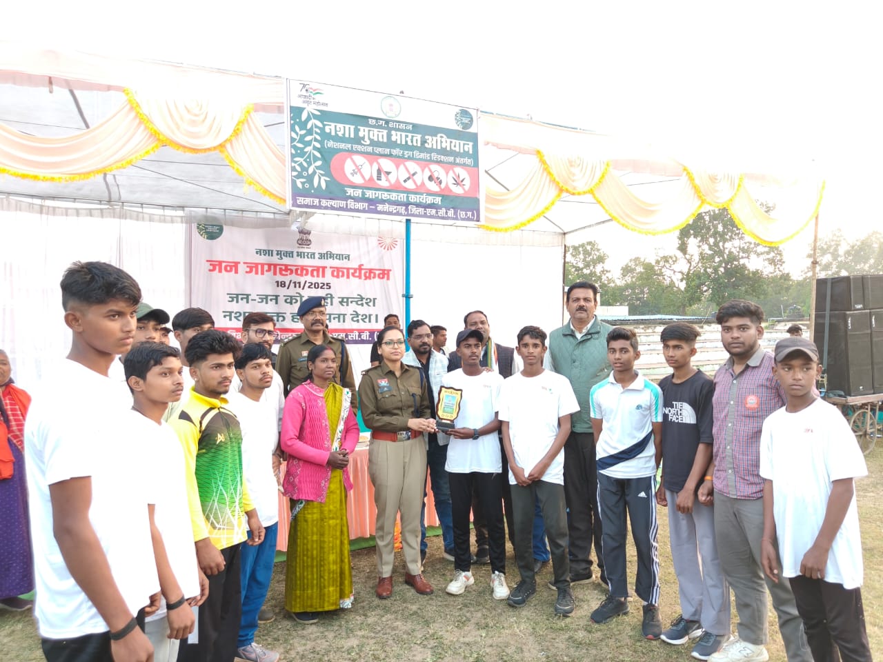 सरगुजा रेंज के पुलिस महानिरीक्षक दीपक कुमार झा एवं एमसीबी पुलिस अधीक्षक श्रीमती रत्ना सिंह के निर्देशन में नशा मुक्ति हेतु जारी जागरूकता अभियान के तहत 18 नवम्बर 2025 को पुलिस चौकी खोँगापानी द्वारा यमुना प्रसाद शास्त्री स्कूल मैदान में बच्चों के बीच क्रिकेट प्रतियोगिता आयोजित की गई। कार्यक्रम का संचालन पुलिस अधीक्षक की अध्यक्षता में किया गया। कार्यक्रम में मनेन्द्रगढ़ एसडीओपी अलेक्सियुस टोप्पो, चौकी प्रभारी राकेश शर्मा, नगर पंचायत उपाध्यक्ष विवेक चतुर्वेदी, पूर्व पार्षद परमहंस मनी, पूर्व पार्षद जगदीश मधुकर, पूर्व एल्डरमैन पिंटू भास्कर, क्षेत्र के वरिष्ठ नागरिक, जनप्रतिनिधि, शिक्षकगण तथा लगभग 200 छात्र-छात्राएं व आमजन उपस्थित रहे। वहीं समापन पर एसपी रत्ना सिंह ने खेलों को स्वास्थ्य व नशा मुक्ति का प्रभावी माध्यम बताते हुए नशे से दूर रहने और नशा बेचने वालों की सूचना पुलिस को देने की अपील की। सभी को नशा मुक्ति की शपथ दिलाई गई तथा उत्कृष्ट खिलाड़ियों को पुरस्कृत किया गया। जिला पुलिस द्वारा नशे के अवैध कारोबार के विरुद्ध लगातार कठोर कार्रवाई की जा रही है और जागरूकता कार्यक्रमों से जनता में पुलिस के प्रति विश्वास बढ़ रहा है।