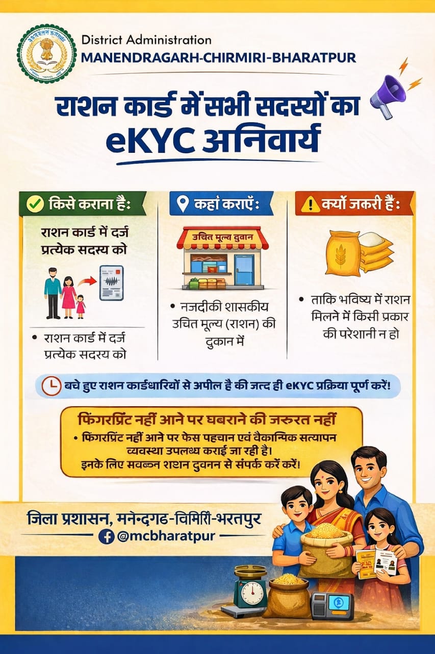 एमसीबी, छत्तीसगढ़। जिला प्रशासन, मनेन्द्रगढ़-चिरमिरी-भरतपुर (छत्तीसगढ़) द्वारा जिले के समस्त राशनकार्ड धारकों को सूचित किया जाता है कि सार्वजनिक वितरण प्रणाली के अंतर्गत राशन कार्ड में दर्ज सभी सदस्यों का e-KYC कराना अनिवार्य है। e-KYC की प्रक्रिया जिले की समस्त शासकीय उचित मूल्य (राशन) दुकानों के माध्यम से कराई जा रही है। जिन राशन कार्डों में सभी सदस्यों का e-KYC पूर्ण नहीं होगा, उनमें भविष्य में राशन वितरण प्रभावित होने की संभावना रहेगी।